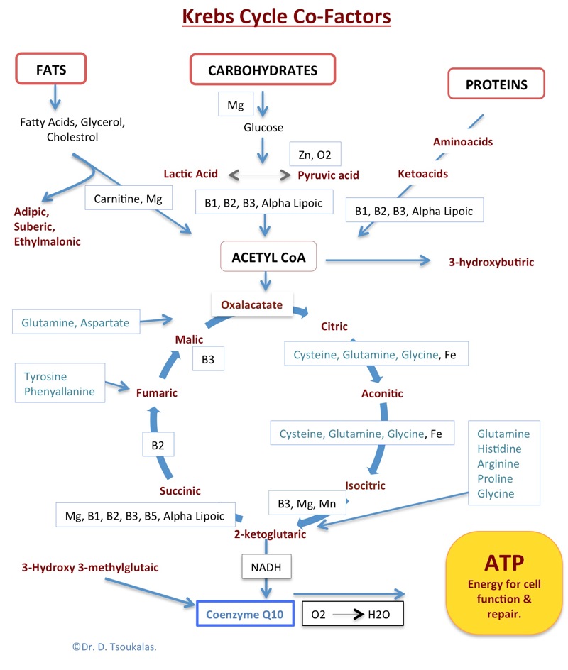 Διαταραχές στα ενδιάμεσα στάδια του κύκλου του Κρέμπς συνδέονται άμεσα με την καρκινογένεση. Για να διεκπεραιωθεί το κάθε βήμα του κύκλου παραγωγής ενέργειας είναι απαραίτητα πολύ συγκεκριμένα συστατικά. Αυτά τα συστατικά χρειάζονται για την ενεργοποίηση των ενζύμων που διεκπεραιώνουν την κάθε χημική αντίδραση. Ανάλογα με το κάθε σημείο του κύκλου τα απαραίτητα μικροθρεπτικά συστατικά μπορεί να είναι η βιταμίνη Β1, η Β3, η Β5, το συνένζυμο Q10, το μαγνήσιο, αμινοξέα όπως η γλουταμίνη, αντιοξειδωτικά όπως η γλουταθειόνη και το άλφα λιποϊκό οξύ,  ο σίδηρος κ.ά.