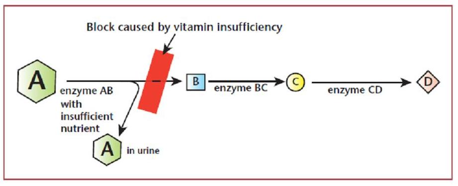 Όταν όμως ένα ένζυμο που μετέχει σε ένα μεταβολικό μονοπάτι δεν λειτουργεί σωστά λόγω της έλλειψης κάποιου απαραίτητου συστατικού, εμποδίζεται τότε η ροή των χημικών αντιδράσεων και έχουμε δυσλειτουργία στο συγκεκριμένο κομμάτι του μεταβολισμού.